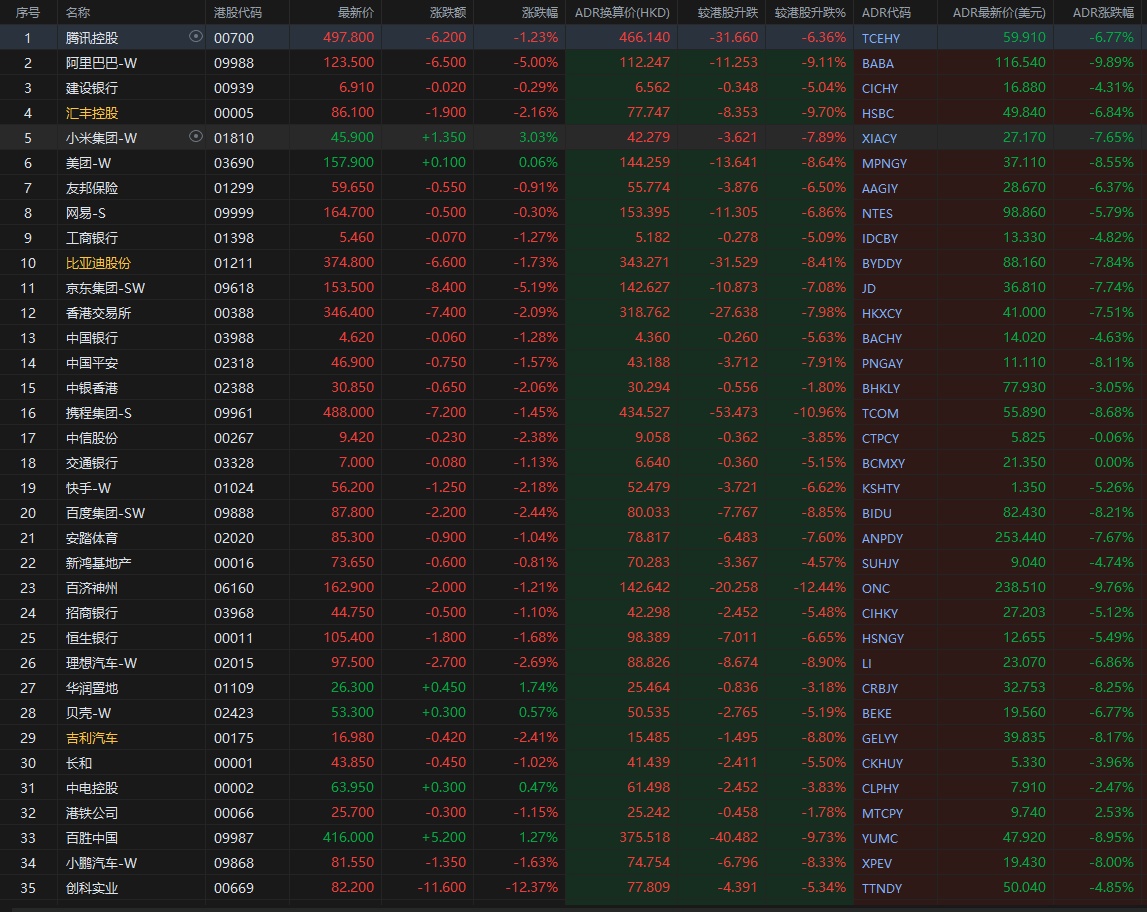 智通财经APP获悉,周五美股三大股指下跌,恒生指数ADR下跌,按比例计算,收报21448.57点,较香港收市下跌1401.24点或6.13%。
