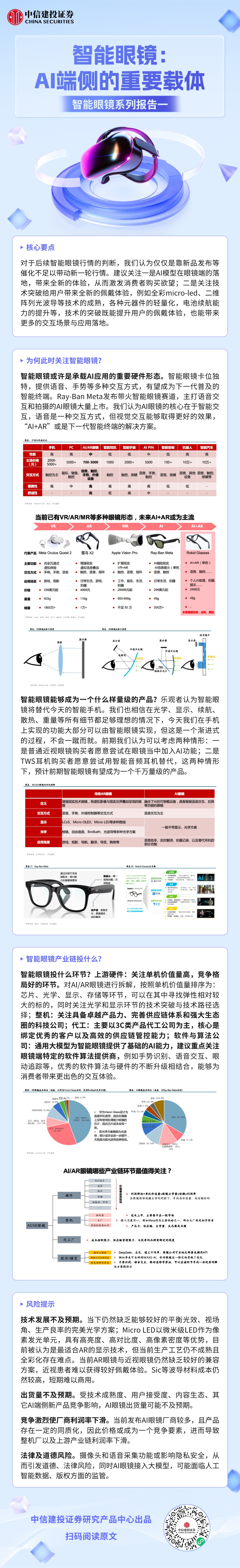 智通财经APP获悉,中信建投证券近日发表智能眼镜行业最新研报,该行认为智能眼镜是AI端侧的重要载体,但仅仅靠新品发布等催化不足以带动新一轮行情。建议关注AI模型在眼镜端的落地,带来全新的体验,从而激发消费者的购买欲望;其次,关注技术突破给用户带来全新的佩戴体验。