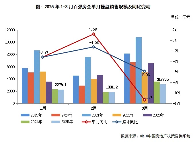 智通财经APP获悉,克而瑞地产研究表示,百强房企3月业绩环比增长68.9%。2025年3月,中国房地产市场整体保持低位运行,延续止跌回稳态势。3月,TOP100房企实现销售操盘金额3177.6亿元,环比增长68.9%、同比降低11.3%,单月业绩规模保持在历史低位。