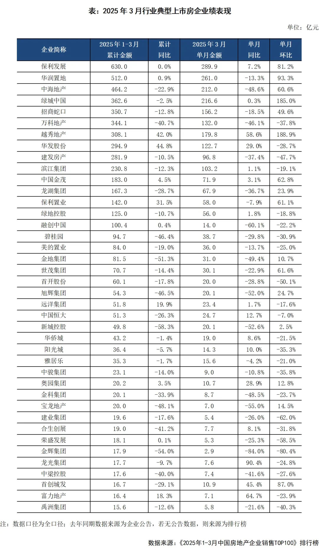 从企业表现来看,2025年3月百强房企的单月业绩环比提升,主要由TOP30房企带动。其中,保利发展、绿城中国、越秀地产、中国金茂等房企表现较好,单月业绩同环比均实现正增长。而整体来看,3月单月业绩环比降低的百强房企达到近7成,集中在TOP31-50和TOP51-100梯队。