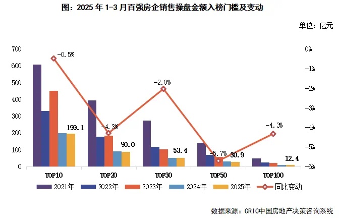 2025年3月,百强房企各梯队销售门槛下移。其中,TOP20和TOP30房企销售操盘金额门槛分别同比降低4.3%和2%至90亿元和53.4亿元。TOP50和TOP100房企门槛分别同比降低5.7%和4.3%至30.9亿元和12.4亿元。