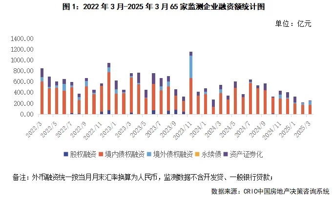 融资总量:2025年3月65家典型房企的融资总量为251.11亿元,环比增加16.3%,同比减少53.9%。从全年的累计数据来看,65家典型房企的累计融资总量为796.84亿元,同比减少39.1%。在融资结构方面,本月房企境内债权融资179.3亿元,环比增加2.8%,同比减少54.8%;境外债权融资66.79亿元,环比增加83.5%,同比增加3%;资产证券化融资5.01亿元,环比持平,同比减少94%。