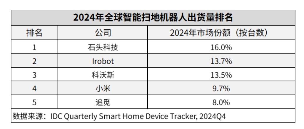根据国际数据公司IDC,2024年石头科技斩获全球范围内销售量和销售额的双料第一,其中出货量层面石头科技更是首度超过iRobot拔得头筹。