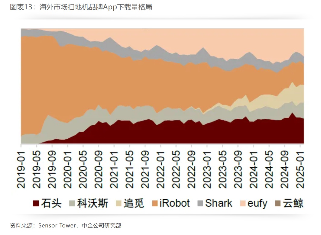 中金公司分析师团队分析了和销量关联度较高的App下载量数据,观察到中国背景的扫地机品牌在各大市场全面抢占iRobot份额。