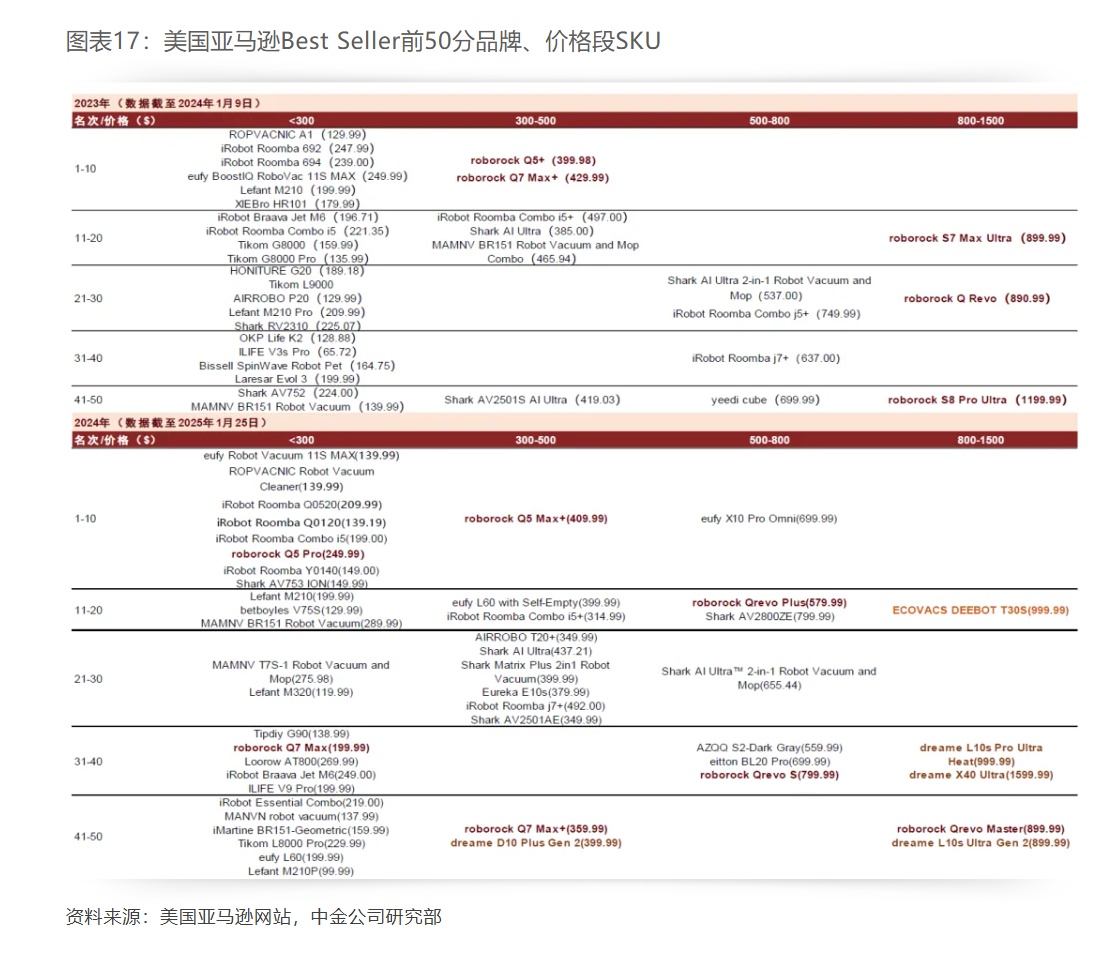 为了更进一步抢夺市场份额,中国扫地机品牌在海外持续扩宽价格带。结合欧美代表市场亚马逊Best Seller排名前50名的扫地机产品,以及中国扫地机品牌在欧美主要亚马逊站点的销售均价,中金分析师观察到,以石头科技为首的中国品牌的价格分布在不断向下拓宽。