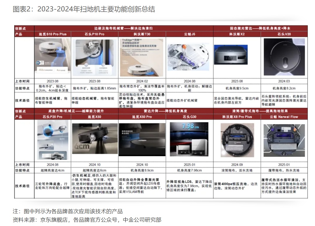 具体而言,2022年下半年中国扫地机行业进入微创新阶段,除去软件算法的升级,硬件部分的创新集中在内部的细节优化和基站功能的不断叠加,例如吸力增加、防缠绕滚刷、基站自动上下水、热水复洗等,这个阶段扫地机的产品形态基本没有任何改变。