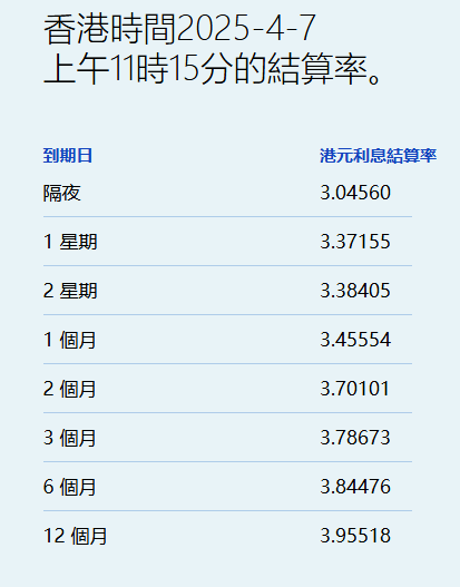 智通财经APP获悉,4月7日,贸易战激化触发全球股市大跌,港元汇率今早最低见7.7680兑1美元,为3月11日以来最低,港元拆息普遍上升,其中隔夜息升至3.0456%,一周拆息升28基点至3.37155%,而与楼按相关的一个月拆息结束六连跌,微升至3.45554%。