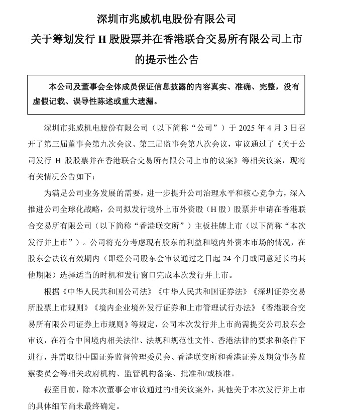 智通财经APP获悉,4月7日,兆威机电(003021.SZ)发布公告称,为满足公司业务发展的需要,进一步提升公司治理水平和核心竞争力,深入推进公司全球化战略,公司拟在境外发行股份(H股)并在香港联交所主板上市。本次发行H股及上市尚需提交公司股东大会审议,并经中国证监会备案、取得香港联交所和香港证监会核准。
