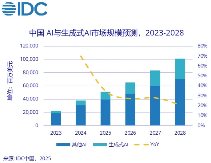 IDC数据显示,2024年中国生成式AI占AI市场投资总规模的18.9%。随着生成式AI技术的快速发展,2028年生成式AI投资占比将达到30.6%,投资规模超300亿美元,五年复合增长率为51.5%。IDC认为,生成式 AI 在多个领域展现出强大的应用价值,正加速各行业自动化进程,从通用场景到特定行业,都能产生显著影响。企业员工可借助生成式AI,快速总结报告、撰写职位描述、优化工作任务,极大提升办公效率,助力决策制定;开发人员可使用生成式AI丰富开发流程,生成测试用例,缩短开发周期,提升软件质量。在工业、营销、医疗等领域,生成式AI可在几秒内完成工业设计草图、广告文案创作、医疗影像分析,催生更多创新解决方案,创造经济效益。