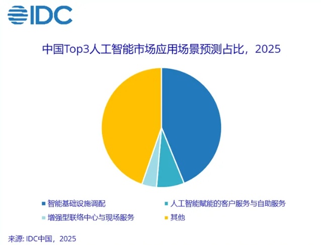 IDC数据显示,在人工智能应用场景中,智能基础设施调配(AI Infrastructure Provisioning)成为中国AI市场最大的应用场景,其支出占AI市场约四成。它包括基础设施服务提供商为AI系统创建和管理IT基础设施的投资,即基础设施服务提供商向用户授予对此基础设施的访问权限,为AI系统开发提供计算和存储所需的资源,或向最终客户提供AI服务。市场规模第二大的应用场景是人工智能赋能的客户服务与自助服务(AI-enabled Customer Service and Self Service)。该场景利用动态知识库自动生成知识文章,高效解决客户疑问,能多语言互动、精准定位知识空白并提供个性化推荐;还可实时处理客户问题,帮助客户进行自助服务。增强型联络中心与现场服务(Augmented Contact Center and Field Service)是第三个领先的应用场景。该场景借助数字渠道与智能 IVR,助力客户解决问题、完成任务,优化客服排班;同时为现场服务技术人员提供任务信息与支持,搭建知识库助力服务提升。