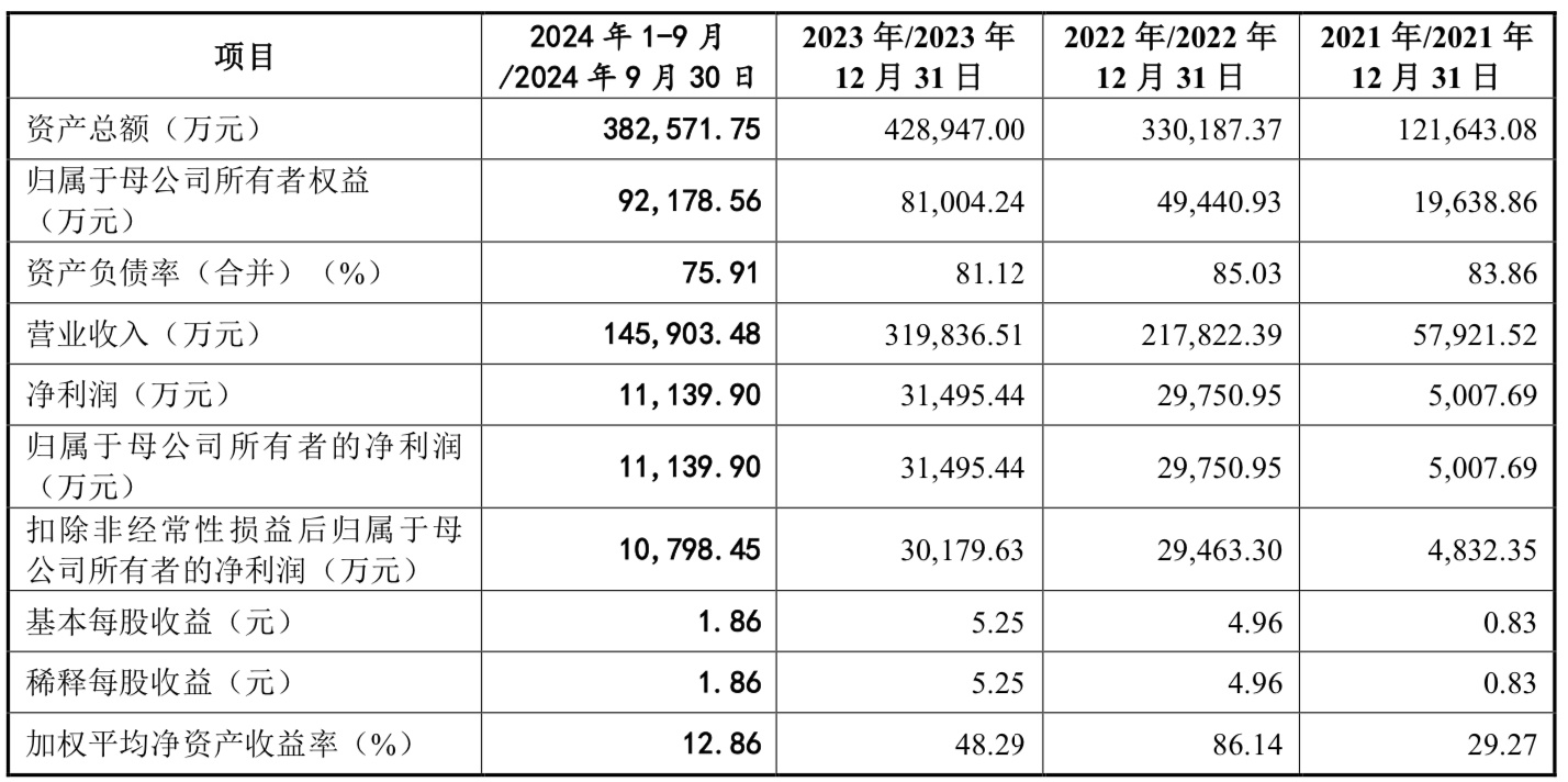 宏工科技于招股书中表示,2021年至2023年公司营业收入大幅增长主要系公司与头部客户合作项目不断增加。2024年以来,公司下游领域扩产节奏放缓,公司营业收入出现下滑。2024年1-9月营业收入及净利润分别约为14.59亿元及 1.11亿元,同比下滑26.44%及37.42%。