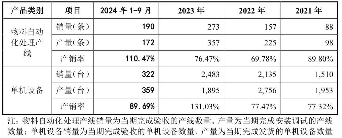 报告期内,宏工科技物料自动化处理产线的产销率分别为 89.80%、69.78%、76.47%、 110.47%,单机设备的产销率分别为 77.32%、 77.47%、131.03%、 89.69%。