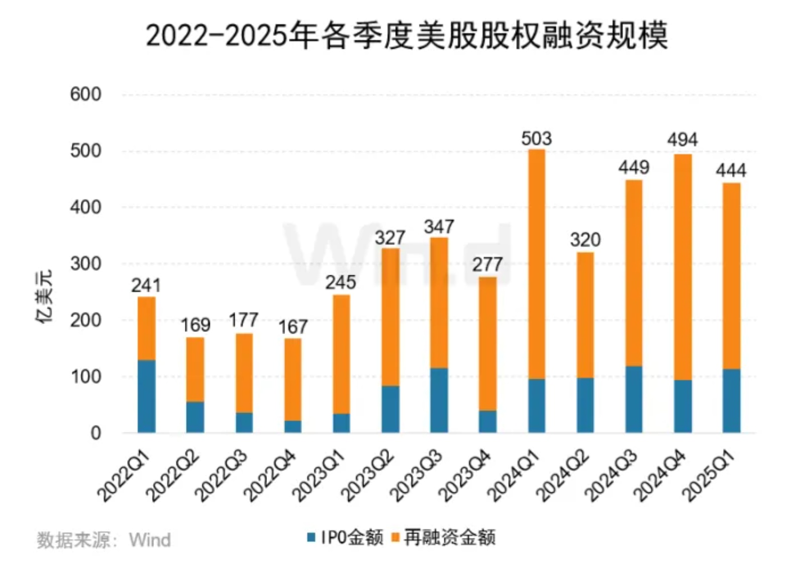 2025年一季度美股一级市场股权融资总金额为444亿美元,较去年同期融资金额503亿美元减少11.80%。其中,IPO融资规模为114亿美元,较去年同期上升18.21%;再融资规模330亿美元,较去年同期下降18.93%。
