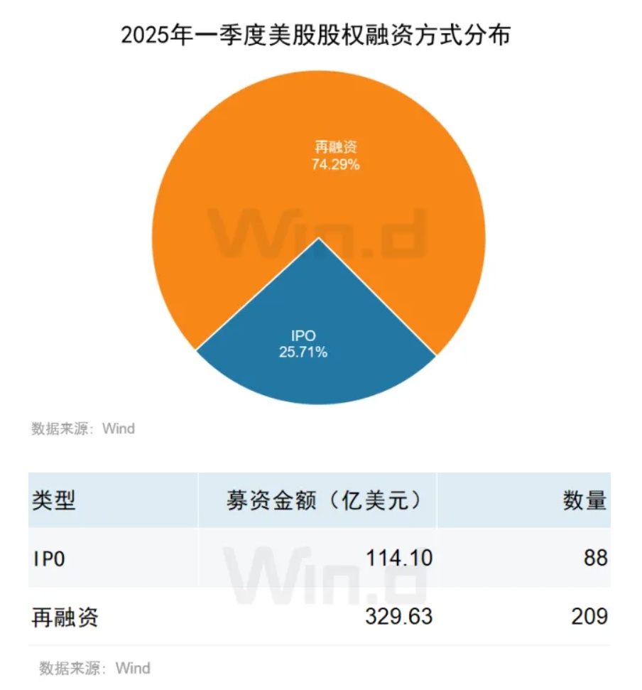 从具体融资方式来看,2025年一季度IPO募资金额为114.10亿美元,占总募集金额的25.71%;再融资金额329.63亿美元,占比74.29%。
