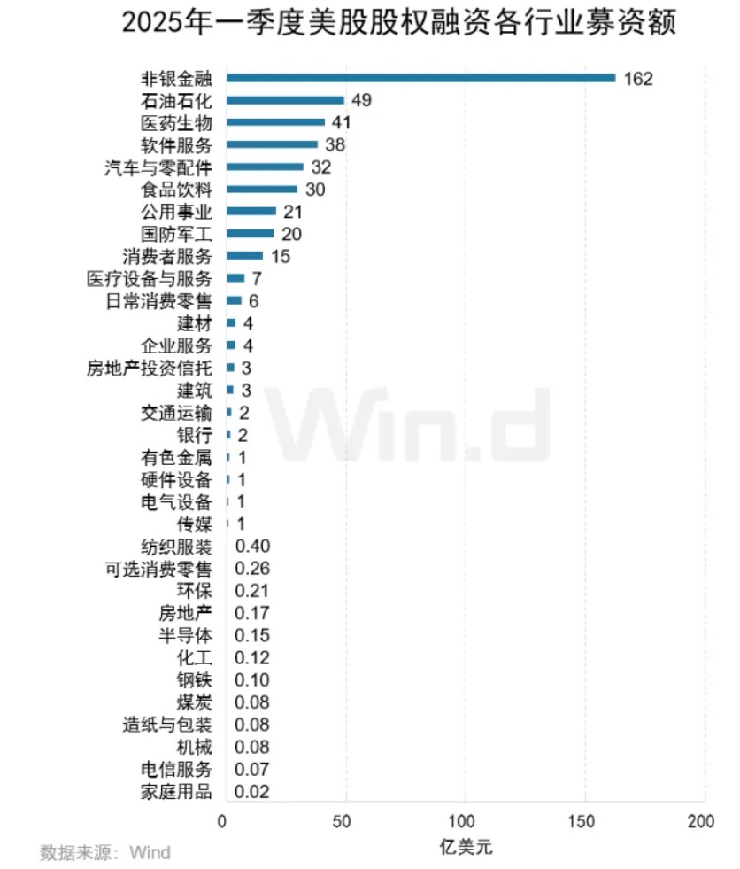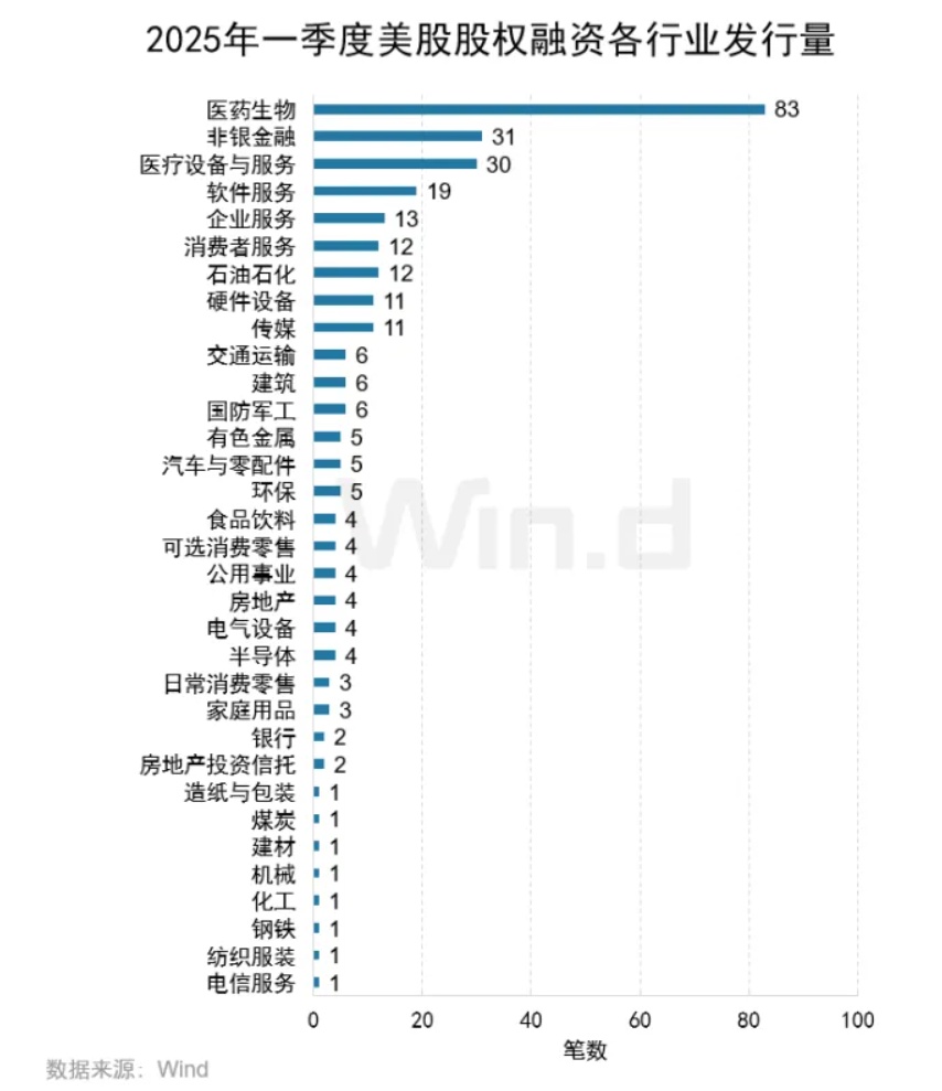 2025年一季度,多项政策调整引发经济局势的不确定性,美股一二级市场均呈降温迹象。道琼斯工业指数一季度下跌1.28%,纳斯达克指数下跌10.42%,标普500指数下跌4.59%。根据Wind数据统计,2025年一季度股权融资(包含IPO与再融资)募资金额为444亿美元,较去年同期的503亿美元减少-11.80%。