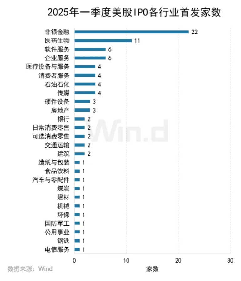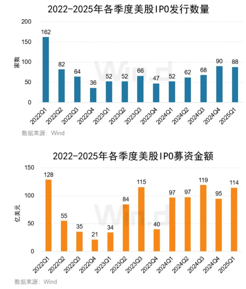2025年一季度美股IPO发行数量为88家,较去年同期增加36家;IPO募集金额为114亿美元,较去年同期上升18.21%。