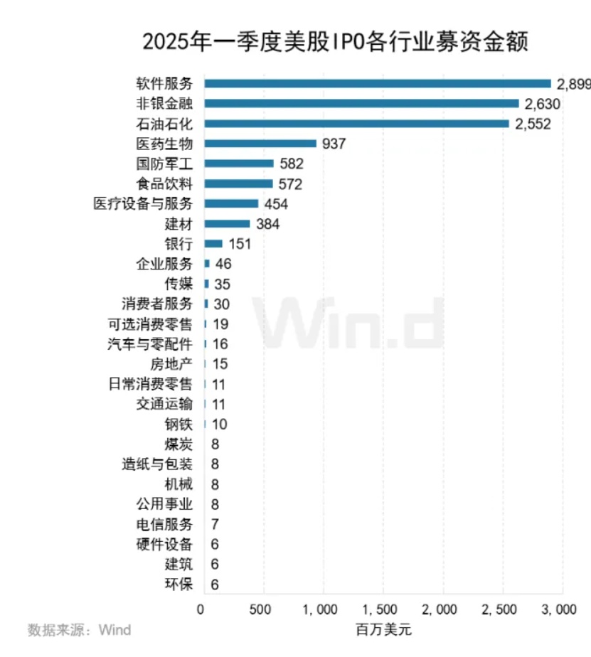 从上市主体行业分布来看,IPO募资规模最高的行业为软件服务,募集金额达29亿美元;非银金融和石油石化行业均以26亿美元的募集金额排名第二。