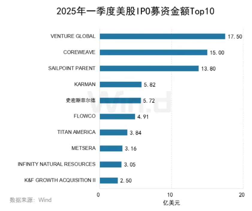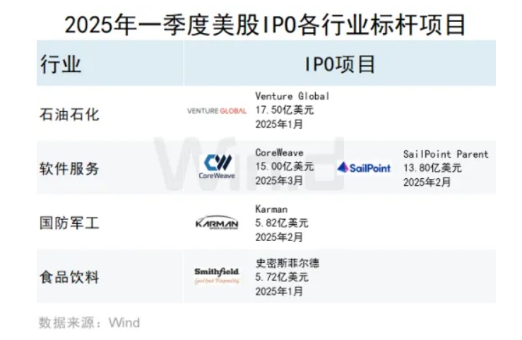 IPO方面,2025年一季度共88家企业成功上市,较去年同期增加36家;融资总金额为114亿美元,较去年同期增长18.21%;IPO募资金额最大的是Venture Global,达17.50亿美元。SPAC方面,2025年一季度IPO融资家数为19家,较去年同期增加11家;融资金额为26亿美元,较去年同期上升57.45%。中概股方面,一季度赴美IPO以中小型企业为主导,上市数量为22家,较去年同期增加9家;融资金额仅为3亿美元,较去年同期减少83.05%。
