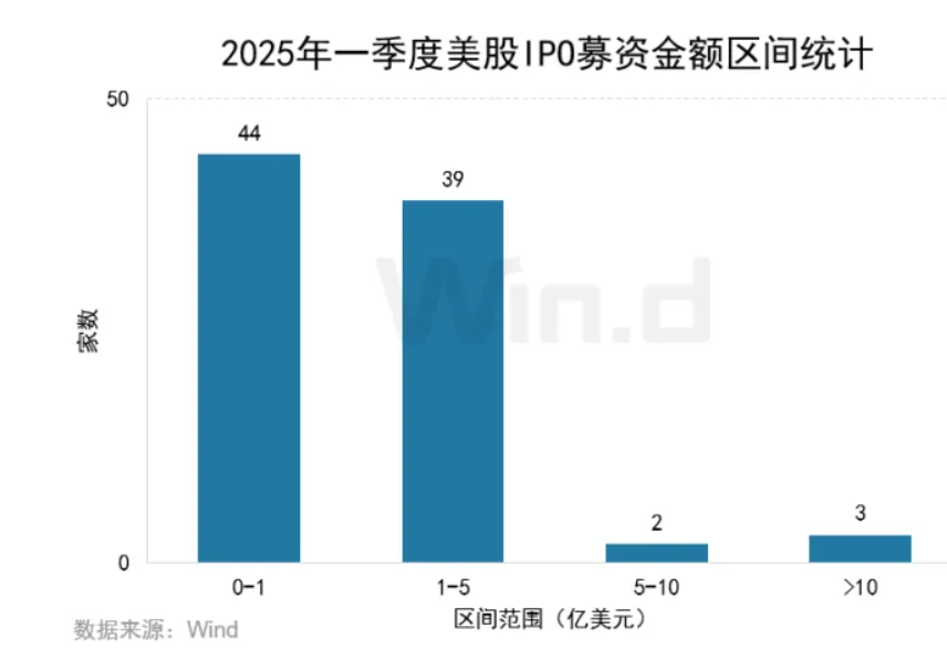 2025年一季度美股IPO融资金额在1亿美元及以下的数量共44家,占到IPO总数的一半;融资规模在1-5亿美元区间的数量为39家,在5-10亿美元区间的为2家,10亿美元以上的为3家。