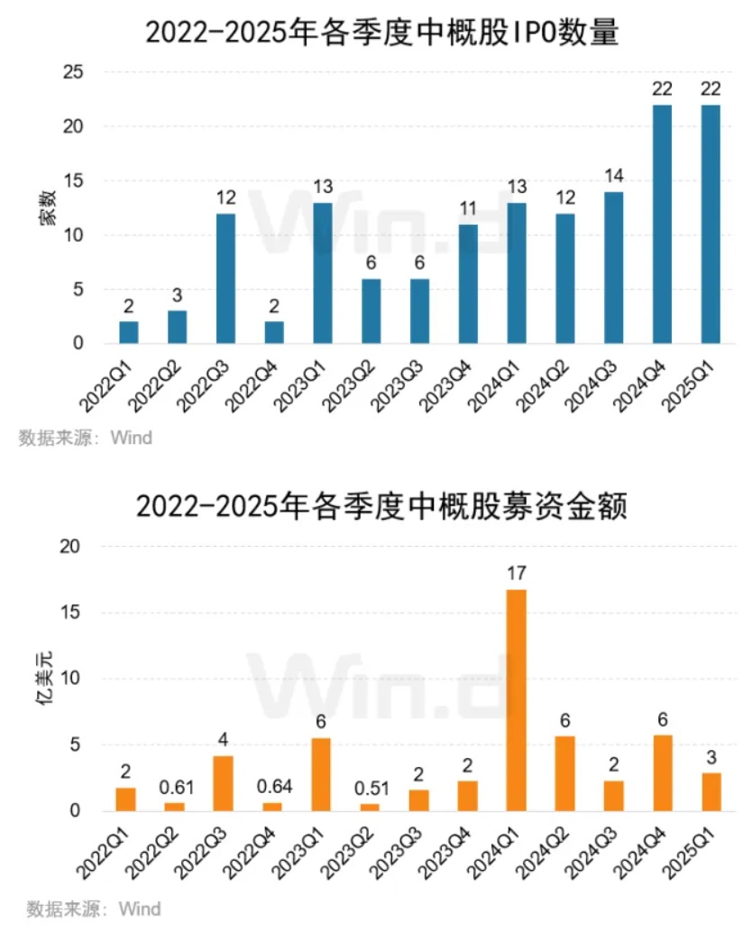 2025年一季度共有22家中国企业实现赴美上市,较去年同期增加9家,融资规模为3亿美元,较去年同期下降83.05%。仅1家头部企业亚盛医药(1.26亿美元)融资额过亿。