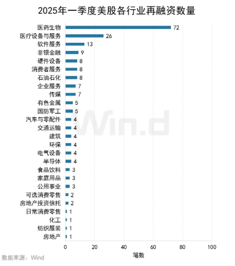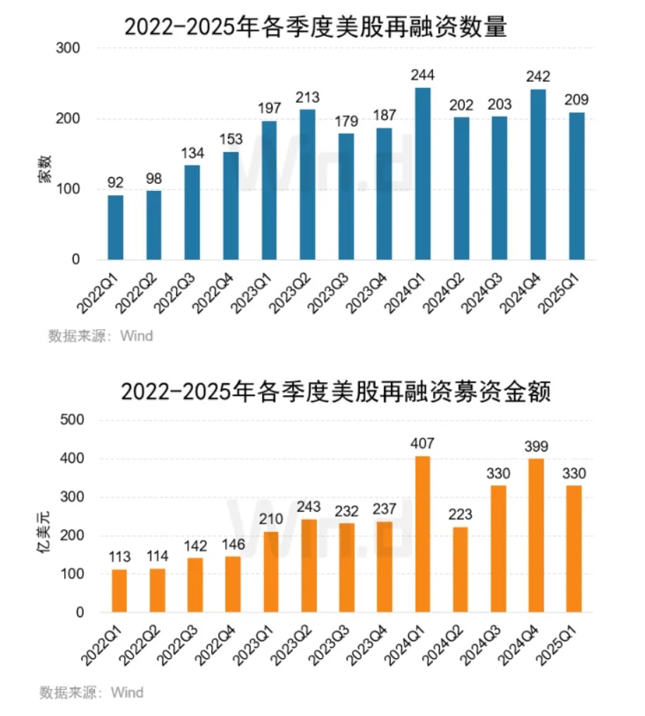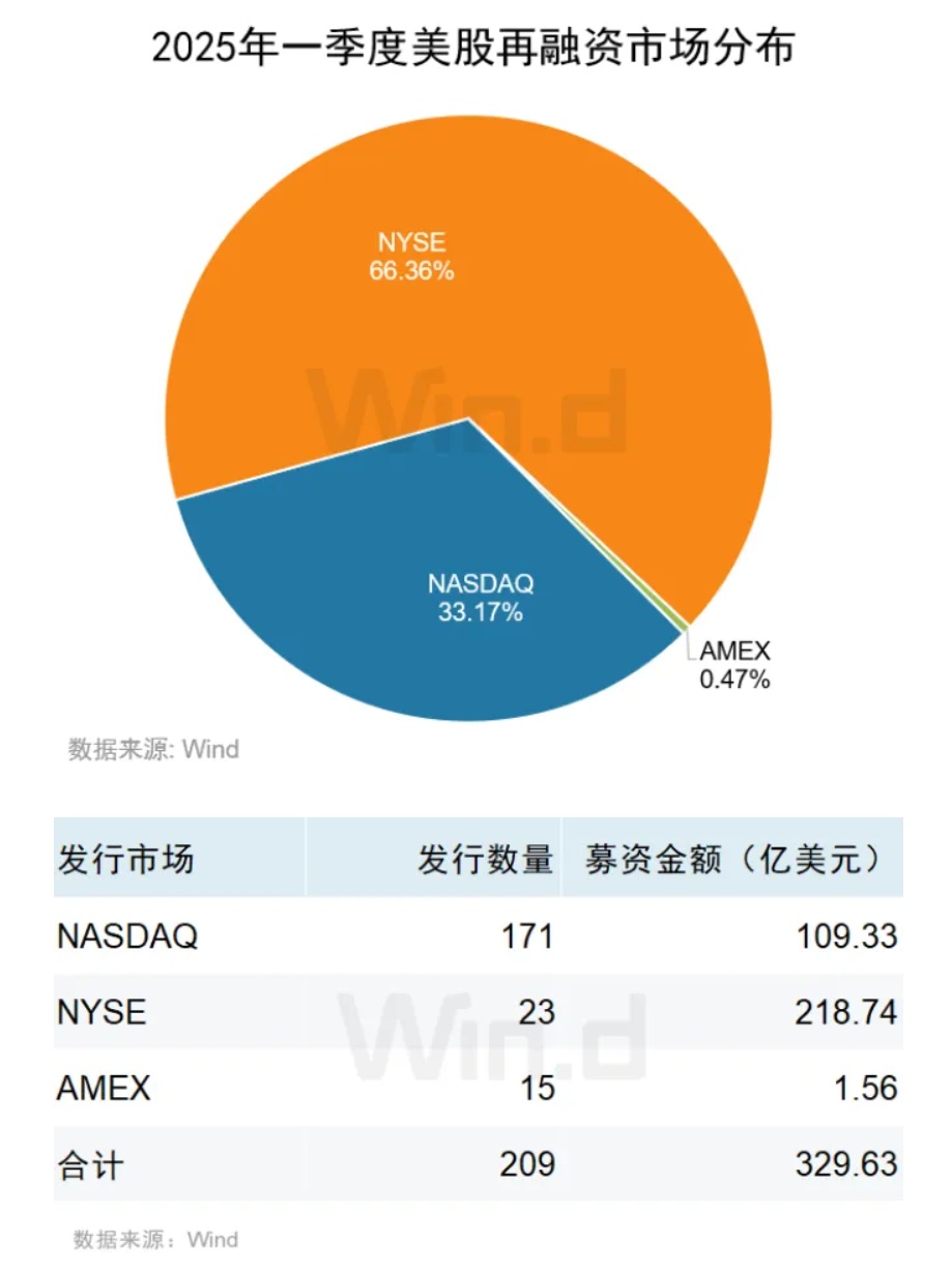 2025年一季度美股市场再融资募集金额共330亿美元,较去年同期下降18.93%;再融资事件为209起,较去年同期的244起减少14.34%。