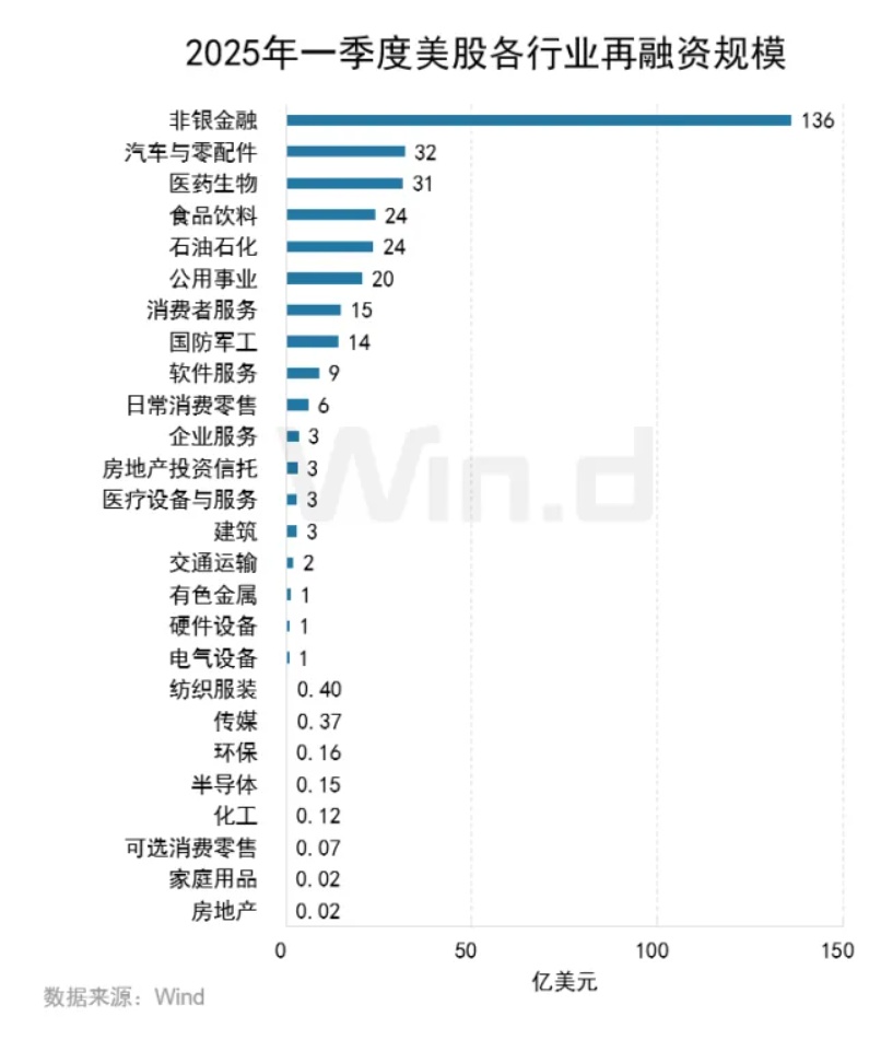 2025年一季度再融资募集金额最高的行业为非银金融,再融资规模为136亿美元;汽车与零配件行业以32亿美元的募集金额排名第二;医药生物行业以31亿美元的募集金额位列第三。
