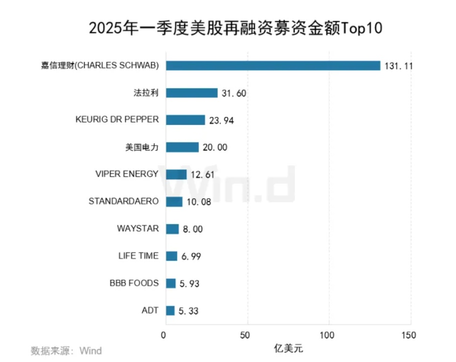 2025年一季度再融资金额最高的公司是嘉信理财(Charles Schwab),为131.11亿美元;法拉利和Keurig Dr Pepper分别以31.60亿美元和23.94亿美元位列第二名和第三名。