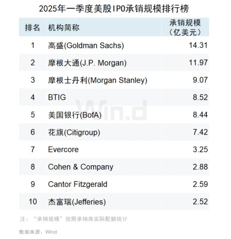 2025年一季度,从IPO承销金额来看,高盛以14.31亿美元的承销金额位居IPO承销榜榜首,承销家数为8家;摩根大通以11.97亿美元的承销金额位居第二,承销家数为6家;摩根士丹利以9.07亿美元的承销金额位居第三,承销家数为4家。