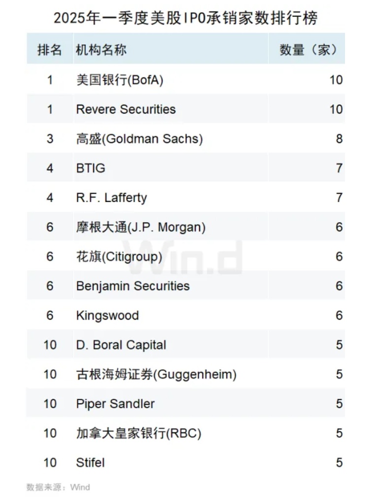 从IPO承销数量来看,美国银行和Revere Securities均以参与10家IPO承销项目位居榜首;高盛以参与8家位列第三。