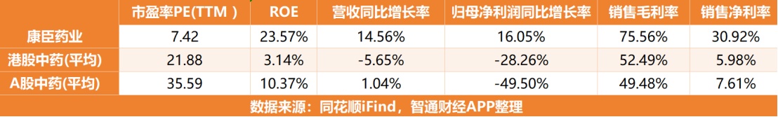 然而截至4月7日,公司市盈率(TTM)仅为7.28倍,与港股中药板块的其他公司对比,康臣药业在ROE指标排第一的情况下,PE估值表现仅位列行业第11,龙头价值亟待修复。