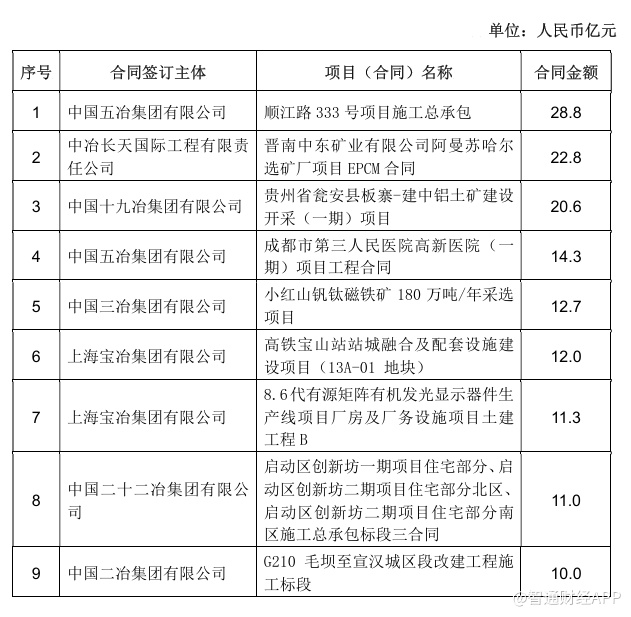 中国中冶(01618)近期部分新签单笔合同额在10亿元以上的重大工程承包项目9个