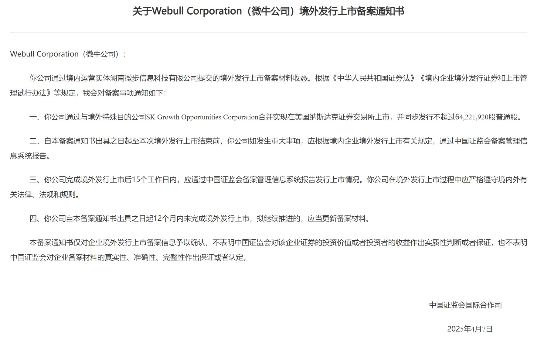 智通财经APP获悉,4月7日,证监会发布《关于Webull Corporation(微牛公司)境外发行上市备案通知书》,微牛公司通过与境外特殊目的公司SK Growth Opportunities Corporation合并实现在美国纳斯达克证券交易所上市,并同步发行不超过64,221,920股普通股。