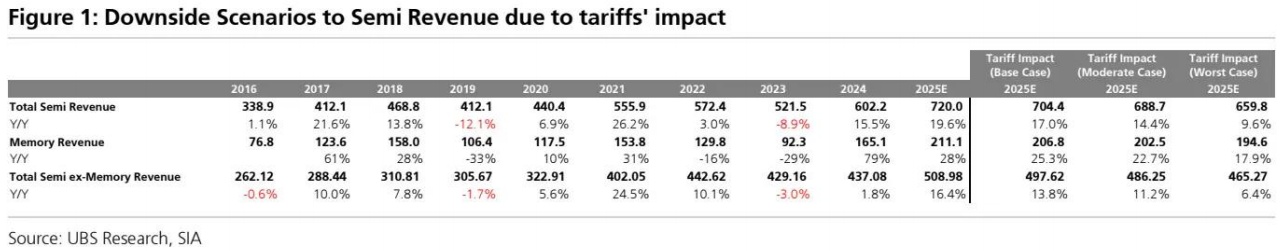 基于此,瑞银美国经济学家对美国2025年实际GDP增速下调了约120个基点,由此推算半导体收入的年增长率可能受约260个基点的冲击,预计2025年半导体收入将达7.04万亿美元(同比增长17.0%,此前预测为19.6%)。