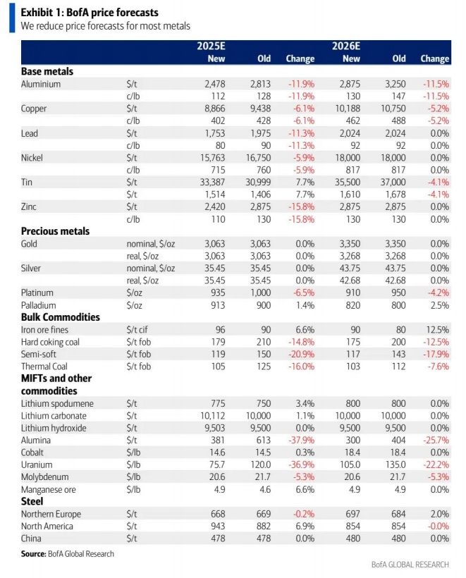美银表示,特朗普政府平衡对外账户和促进制造业发展的目标,导致全球贸易争端愈演愈烈。尽管铝、铜和锌等基本金属的供应受限,但贸易争端可能将今年全球GDP增速拉低至2.6%,而铜价从未在这一增长水平下实现同比上涨。以2018/19年中美贸易争端为例,铜价曾几乎每个季度都在下滑。因此,美银下调了近期贱金属价格预测,不过该行指出,一旦宏观经济环境趋于稳定,将重新评估其观点。