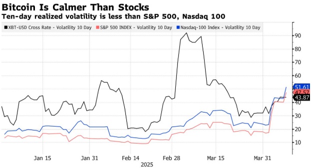 智通财经APP获悉,特朗普关税政策引发美国股市的波动幅度超过了比特币,这是对历史波动趋势的罕见逆转——比特币波动水平这场较股市更高。比特币在过去10个交易日的实际波动率为43.86,低于标普500指数的47.29和纳斯达克100指数的51.26。虽然加密期权市场的短期波动性有所增加,但从长期来看,交易员仍然看涨。