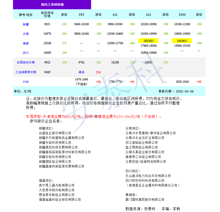 智通财经APP获悉,硅业分会发文称,本周工业硅现货价格下跌。过去一周(2025年4月3日-9日),主力合约收盘价从9820元/吨震荡波动至9485元/吨,跌幅为3.41%。全国综合价格为9922元/吨,下跌310元/吨,其中分牌号来看,553为9701元/吨、441为10158元/吨、421为10551元/吨,分别下跌318元/吨、301元/吨、313元/吨和324元/吨,新疆、云南、福建和四川的综合价格为9831元/吨、10578元/吨、15268元/吨和10650元/吨。FOB价格上涨60美元/吨。