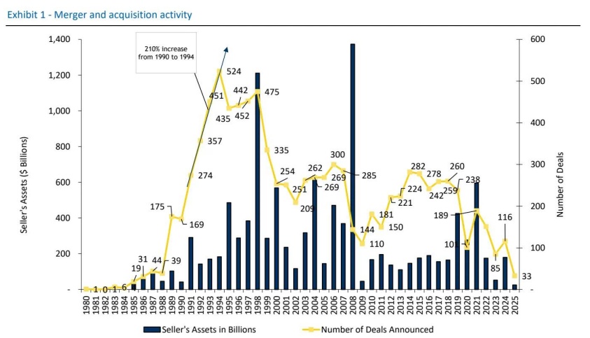 银行并购的最大障碍之一是“按市值计价”问题,这是由利率上升及其对资产负债表中资产端的利率指标的影响所驱动的。假设利率走低,这一障碍预计将在未来减弱。此外,随着每一个季度的过去,在2020年至2021年的低利率环境下放置在银行资产负债表上的更多低收益资产将被“烧掉”。