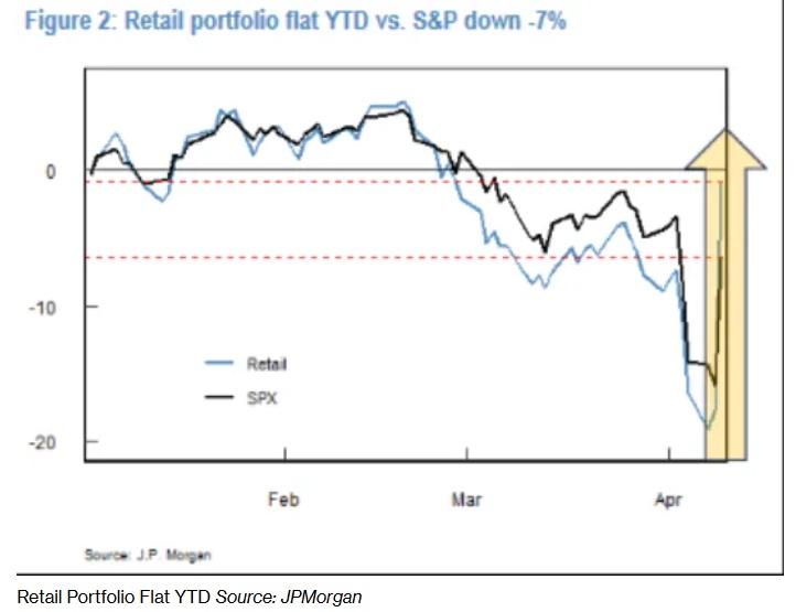 摩根大通全球量化及衍生品策略师Emma Wu的统计数据显示,这帮助他们几乎抹平了年内亏损。同期标普500指数则下跌7.2%,意味着周三“大奇迹日”一举推动散户投资者们大幅跑赢标普500指数。