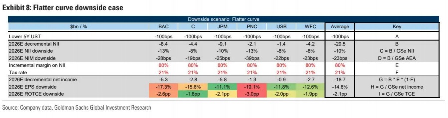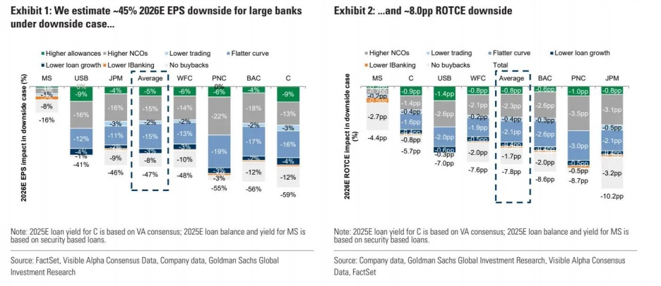 高盛假设银行在2026年底前暂停股票回购,这可能导致EPS下降8%,ROTCE下降约170个基点。花旗和美国银行受此影响最大,EPS影响均约为12%。