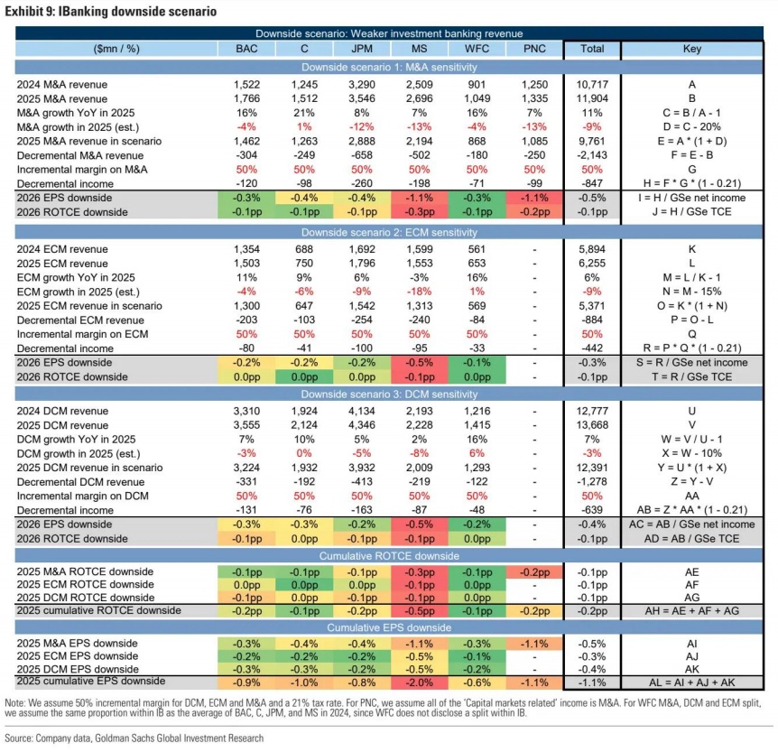在投行业务方面,假设增速放缓20个百分点,这将导致EPS下降1%,有形普通股权益回报率(ROTCE)减少20个基点。具体到各家银行,摩根士丹利(MS.US)的EPS可能下降2%,而富国银行(WFC.US)的EPS仅下降0.3%,显示出显著的分化。