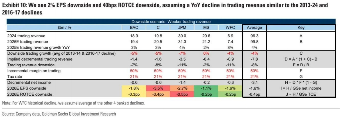 高盛预计交易收入将下降8%,导致EPS下降2%,ROTCE下降40个基点。假设交易收入同比下降4%(与2013-2014年的水平相近),预计将导致EPS减少2%,有形普通股权益回报率(ROTCE)下降40个基点。在这一情景下,花旗银行(C.US)的EPS可能下降4%,摩根大通的EPS可能下降3%,显示出较大的风险敞口。