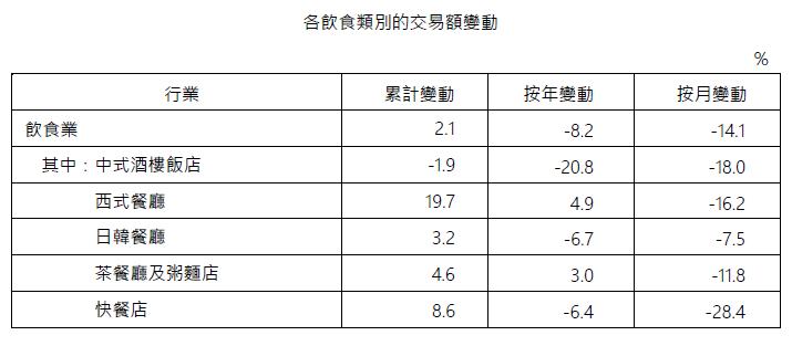 2月各主要饮食类别中,中式酒楼饭店(-20.8%)的交易额同比跌幅较大,日韩餐厅和快餐店的交易额亦分别下跌6.7%及6.4%,西式餐厅则上升4.9%。与1月比较,快餐店、中式酒楼饭店和西式餐厅的交易额分别下跌28.4%、18%及16.2%。