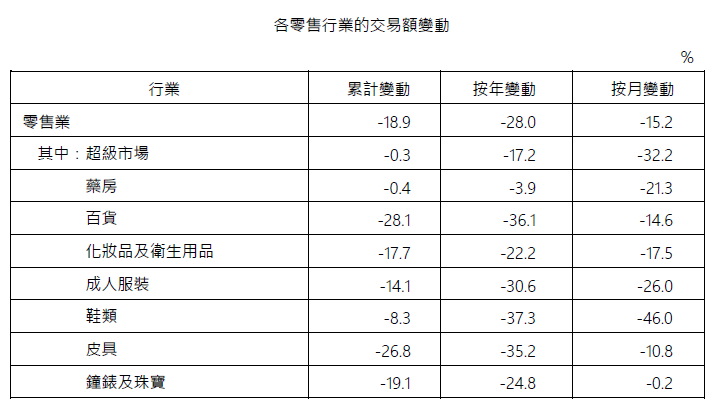 与去年同月比较,2月各主要类型零售商户的交易额均录得跌幅,其中鞋类、百货、皮具和成人服装的交易额录得超过三成跌幅。与1月比较,鞋类(-46%)的跌幅最显著,超级市场、成人服装和药房亦分别下跌32.2%、26%及21.3%。