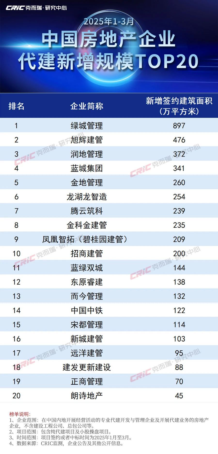 按一季度新增建面分布来看,绿城管理(09979)仍然以“断层”优势保持龙头地位,一季度新拓面积几乎是第二名2倍。有3家企业新增建面超过300万平方米,分别是旭辉建管、润地管理、蓝城集团,基本以政府代建项目新拓为主,其中旭辉建管一季度政府代建比例达到56%,润地管理政府新签规模约301万平方米。另,有6家房企新增建面位于200-300万区间,包括金地管理及龙湖龙智造、金科金建管等“后”入局企业。
