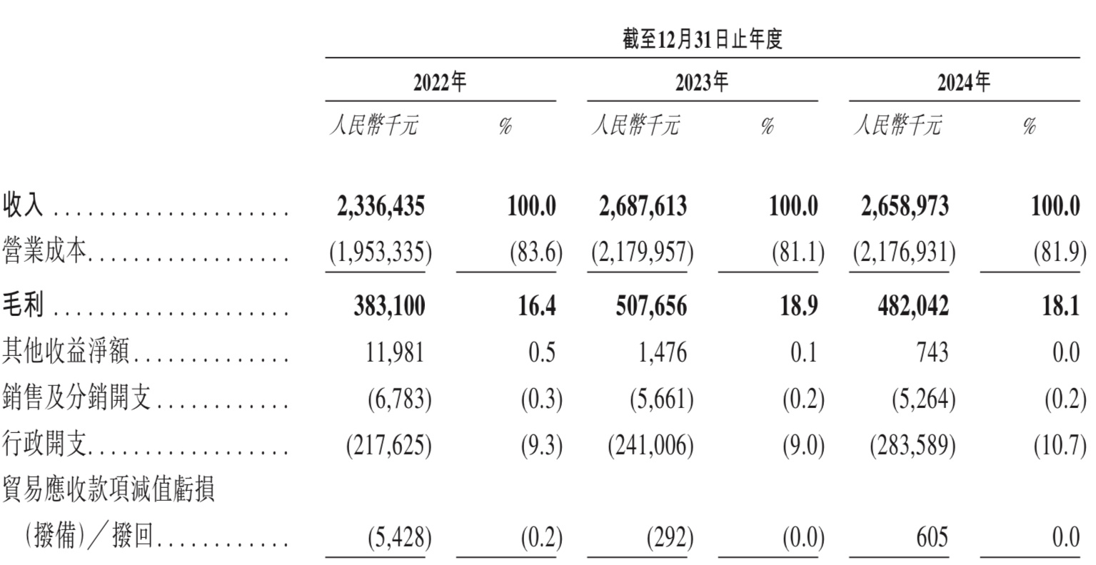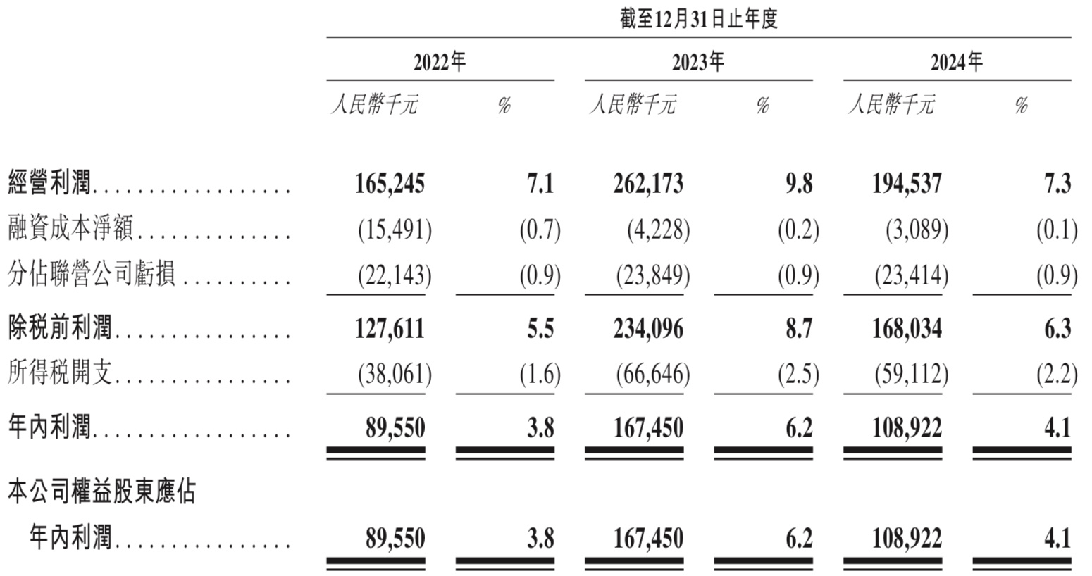财务方面,于2022年度、2023年度、2024年度,公司实现营业收入分别约为人民币23.36亿元、26.88亿元、26.59亿元。同期,公司年内利润分别约为人民币8955万元、1.67亿元、1.09亿元。