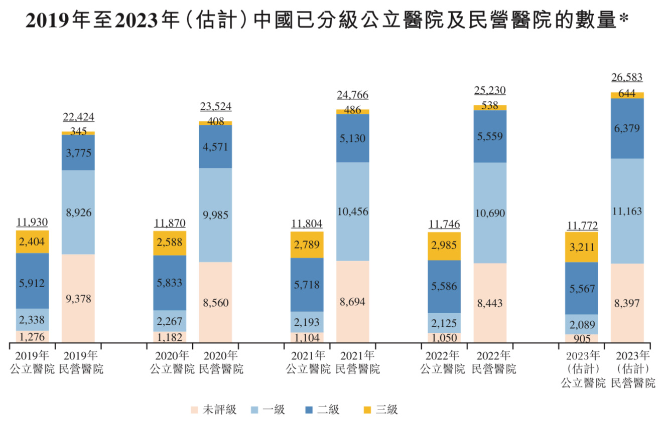 根据弗若斯特沙利文的数据,民营综合医院的数量由2019年的12,572家增至2023年的13,848家,2019年至2023年的复合年增长率为2.4%,并预计增至2027年的15,302家,2023年至2027年的复合年增长率为2.5%,而公立综合医院的数量由2019年的7,391家减至2023年的6,984家,并预计减至2027年的6,615家。