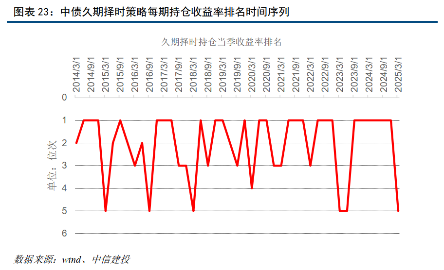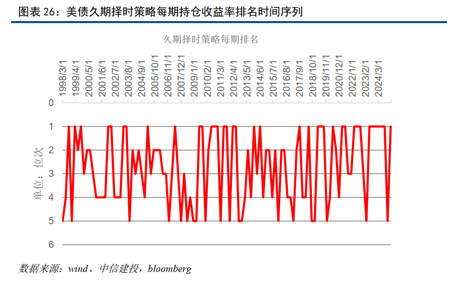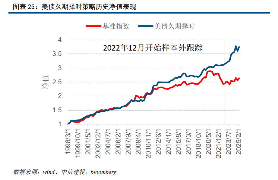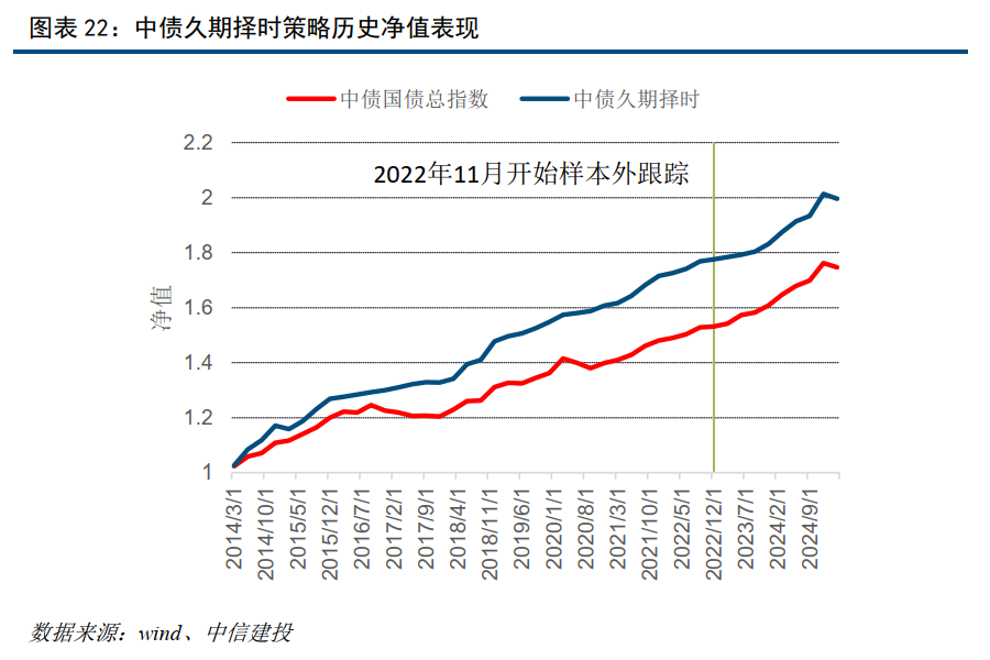 中信建投构建的中债久期择时组合年化收益6.37%,最大回撤1%,季度胜率93.3%。同期基准年化收益5.2%,最大回撤3.38%,季度胜率80%。在中债各个期限品种中,一季度配置建议为7-10年。模型样本外(28个月)绝对收益12.9%。