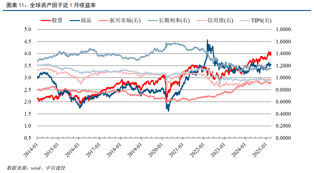 跨市场全球宏观因子体系表现回顾:近期全球增长类因子东升西落。国内金融条件持续宽松。原油供给因子近期有所回升。全球资产因子近1月上涨为主,短期除股票、长期利率、信用债外其余资产不同程度上涨。