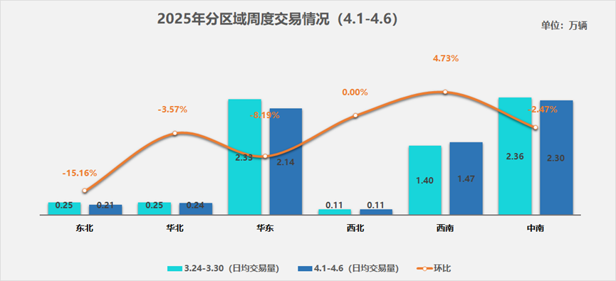 本周,全国二手车日均交易量较上周出现小幅回落。具体从分区域来看,东北、华北、华东以及中南地区均呈现不同程度的下滑态势;西南地区本周二手车交易量逆势增长;而西北地区本周则维持了平稳的交易走势。
