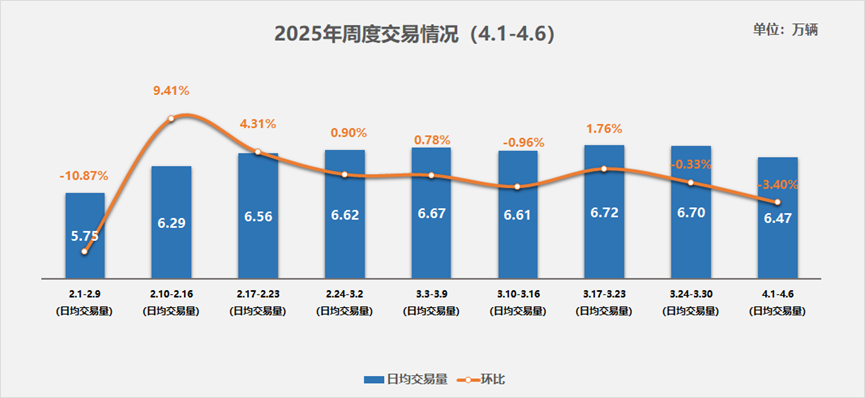 智通财经APP获悉,4月11日,中国汽车流通协会发布二手车周度快报(2025年4月1日-2025年4月6日)。2025年4月1日至6日,二手车市场日均交易量为6.47万辆,环比上周下降3.4%,市场呈现一定压力。这一变化主要受清明假期影响,消费者普遍选择短途出游,导致到店客流量减少。
